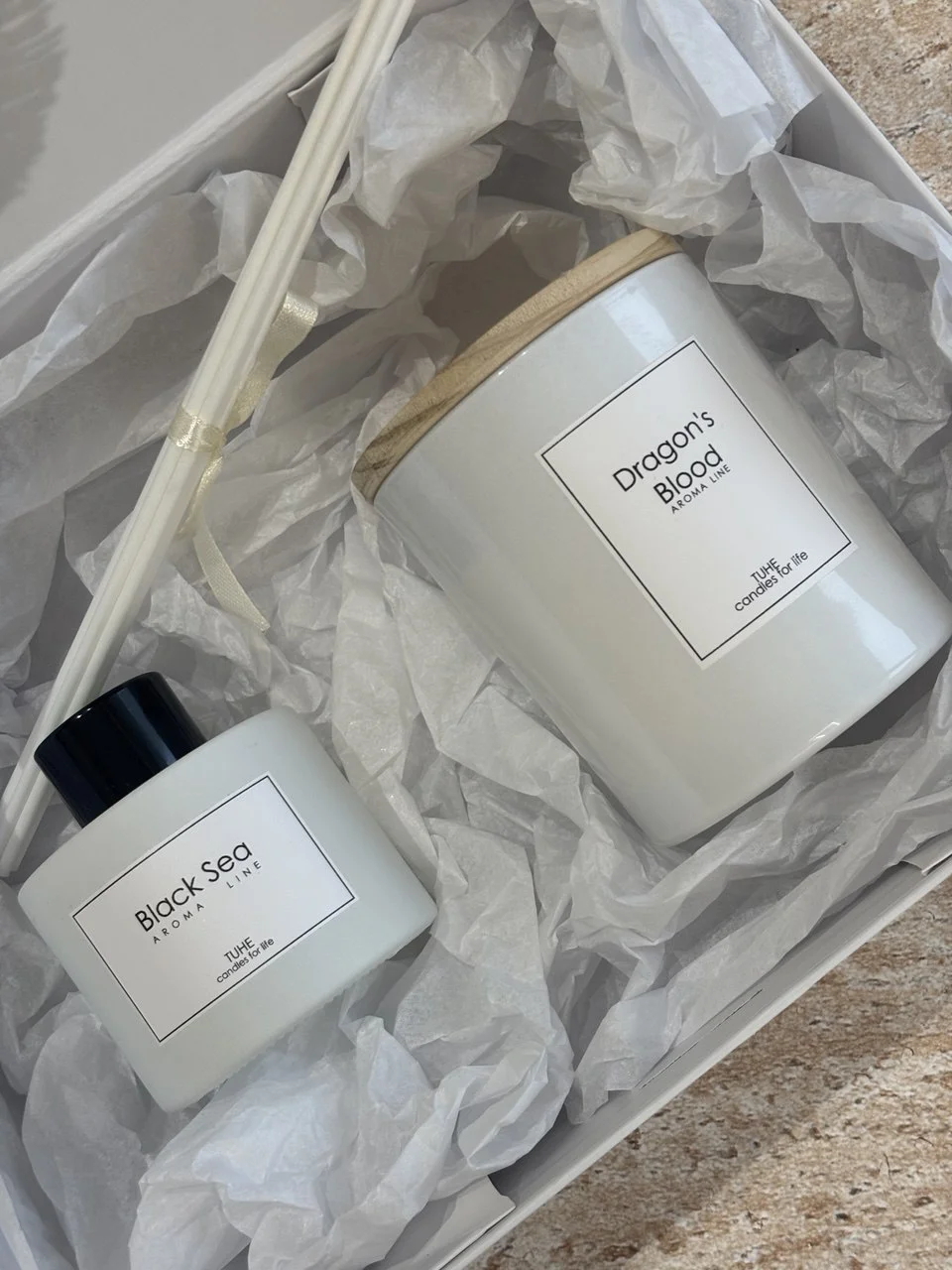 Premium zestaw w eleganckim pudełku z grubego kartonu na magnes, ręcznie robiona świeca z naturalnego wosku oraz luksusowy dyfuzor zapachowy.
