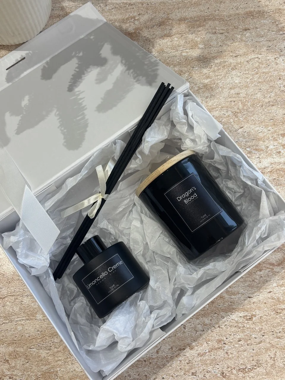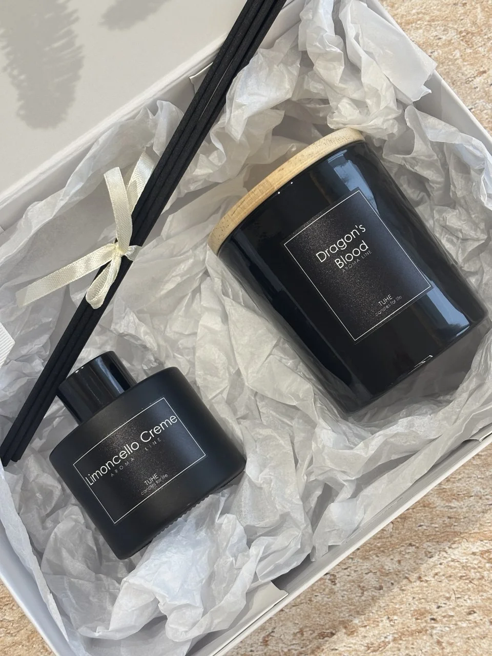 Premium zestaw w eleganckim pudełku z grubego kartonu na magnes, ręcznie robiona świeca z naturalnego wosku oraz luksusowy dyfuzor zapachowy.
